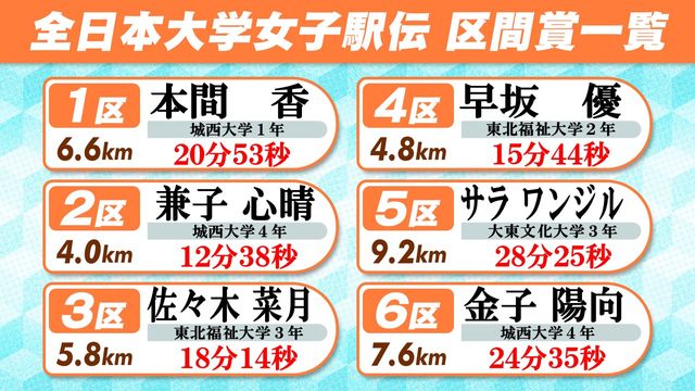 【区間賞一覧】4区間で新記録 1区と3区は記録ラッシュ 6区は金子陽向が区間新で城西大を優勝に導く 東北福祉大も2人が区間賞 2025.10.27 引用元:日テレNEWS NNN◇第43回全日本大学女子駅伝(10月26日、弘進ゴムアスリートパーク仙台発着:全6区間38キロ)城西大学が残り1キロで逆転し、25年ぶりの3度目の優勝。4区間で区間新記録が誕生するハイレベルなレースとなりました。