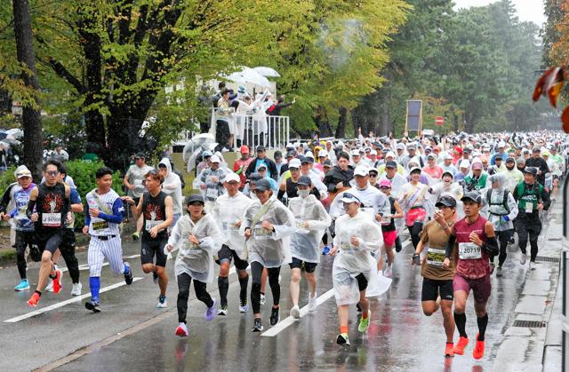 開催は11回目。市中心部のしいのき迎賓館前をスタートし、県西部緑地公園陸上競技場までのコースで、兼六園や金沢駅鼓門、犀川大橋などをめぐった。大会本部によると、1万4790人(94.9%)が完走した。