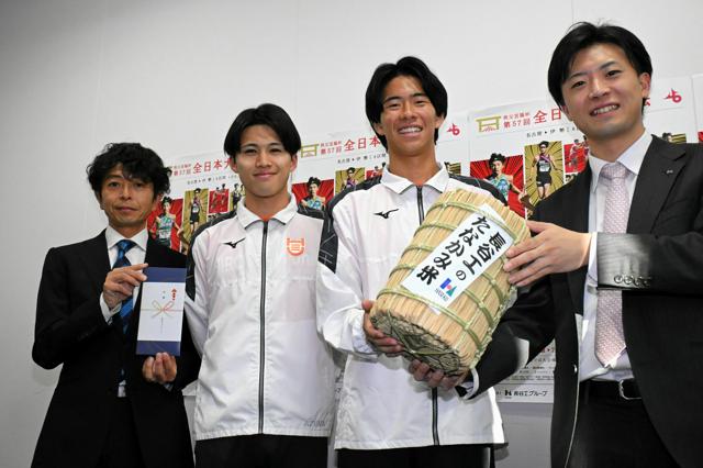 大会特別協賛の長谷工グループからは米1俵の目録が贈られた。大会は11月2日、名古屋市の熱田神宮と三重県の伊勢神宮を結ぶ8区間106.8キロである。(相川智)