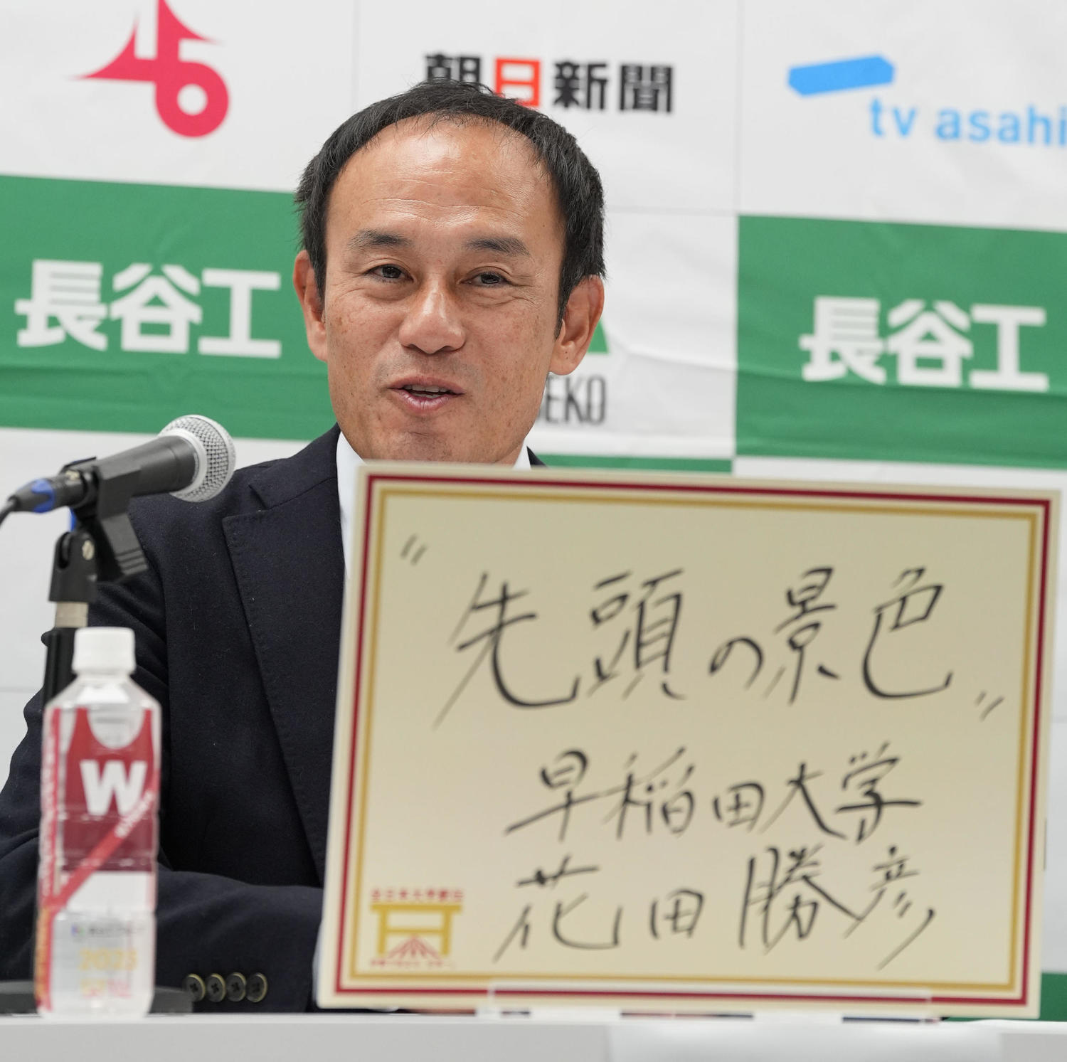 10月の出雲駅伝2位と健闘した早大の花田勝彦監督(54)は「先頭の景色」と書いたフリップを見せ、「ようやく優勝を目標に掲げられるチームになってきたので、それをさらに確実なものにする上での大会にしたい」と3冠達成した2010年以来の全日本制覇に向け、上位争いを誓った。