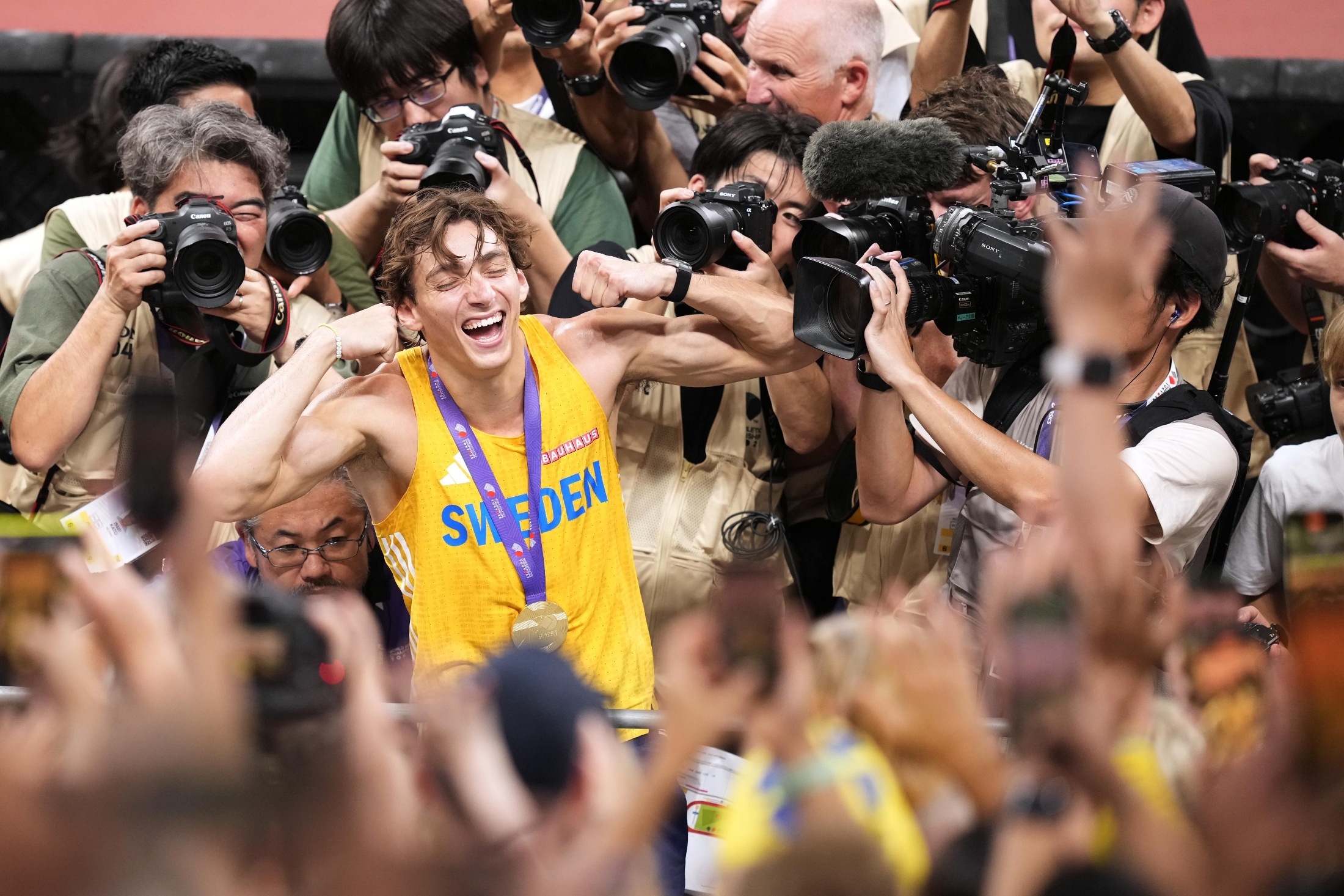 東京・国立競技場に大観衆が詰めかけた陸上の第20回世界選手権は、新型コロナウイルス禍で原則無観客開催だった2021年東京五輪・パラリンピック以来の日本での大規模な国際大会となった。注目を集めた男子棒高跳びの絶対王者、25歳のアルマント・デュプランティス(スウェーデン)は、6m30の世界新記録で世界選手権3連覇を達成した。東京の夜空を舞った「新鳥人」は「全てがうまくいって本当にうれしい」と笑みを浮かべた。(共同通信社写真部取材班)