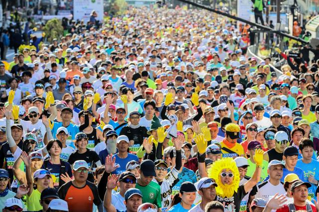 秋晴れのもと、ランナーたちは午前9時、黄色い手袋をつけた両手を高く掲げ、復興を象徴するヒマワリを表現した後、神戸市役所前をスタートした。