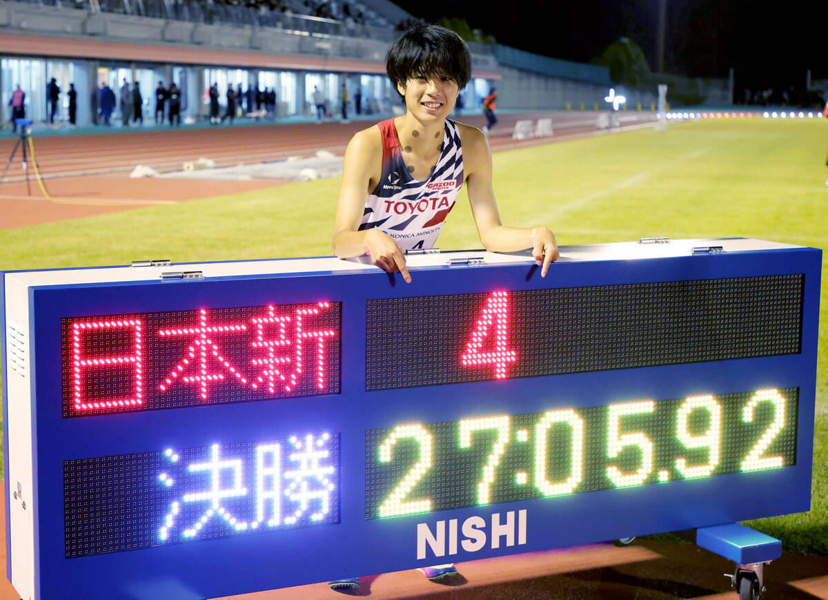 陸上の八王子ロングディスタンスは22日、東京・八王子市上柚木公園陸上競技場で行われ、1万メートル最終A組で9月の東京世界陸上代表・鈴木芽吹(24)=トヨタ自動車=が日本新記録の27分5秒92をマークして日本勢トップの6位だった。23年12月に塩尻和也(29)=富士通=が出した27分9秒80を3秒88更新。日本勢2番手の8位に入った吉居大和(23)=トヨタ自動車=も日本歴代6位の27分21秒45だった。