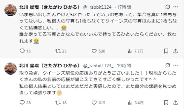 加えて、次の投稿では「いま思い出したんやけど5区やったっていうのもあって、集合写真に1枚も写ってないし、私個人の写真も1枚もなくてクイーンズ駅伝の写真ほんまに1枚もなくて結構悲しい、、 誰か走ってる写真とかなんでもいいんで持ってるひといたらください、救われます」とファンへ呼びかけ。このお願いに、ファンからはレース中の姿をはじめ、レース前後の姿など多くの写真が届くとともに、力走をねぎらうコメントが多数寄せられた。