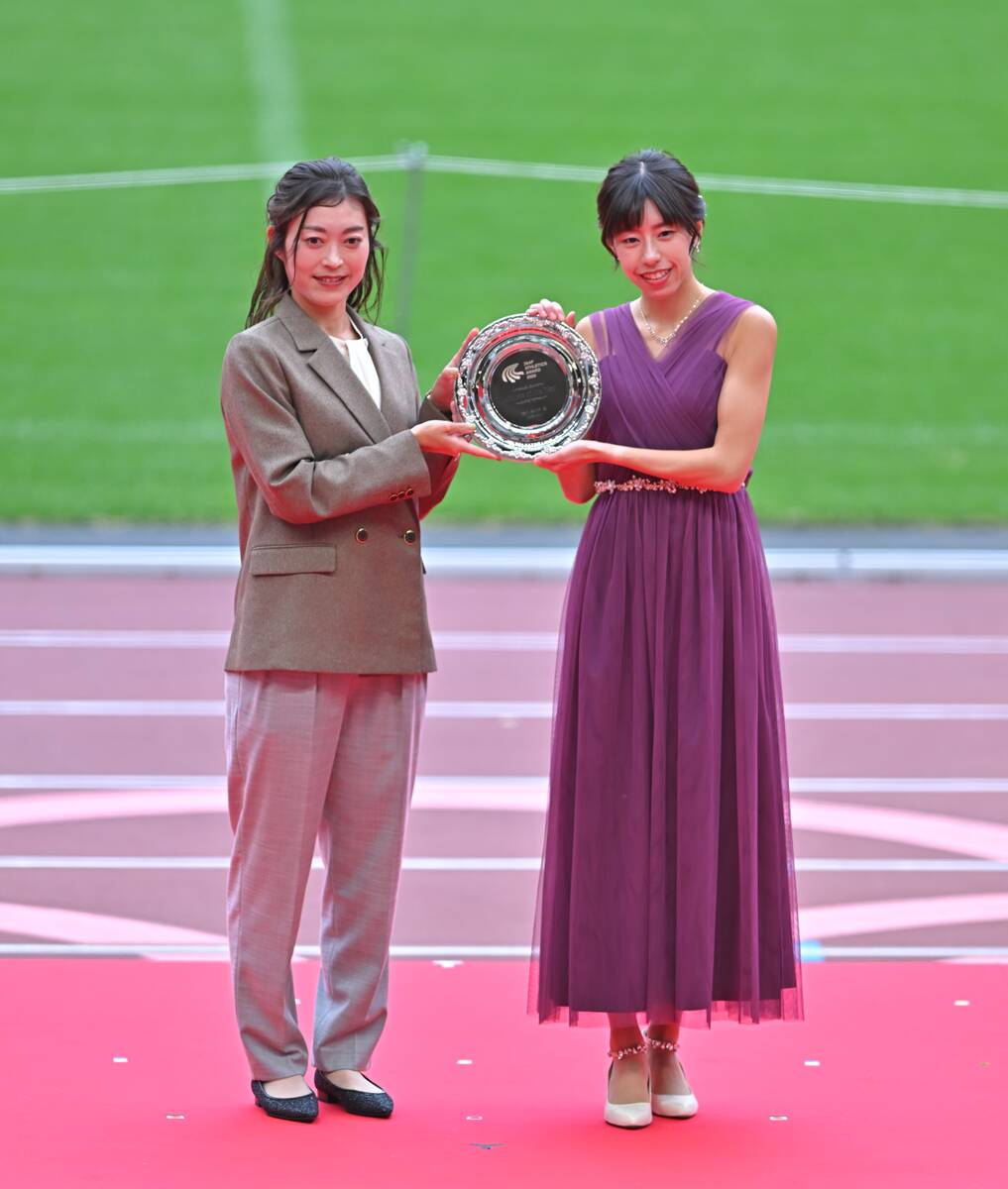 27日に現役引退を発表した競歩女子の岡田久美子(富士通)はプレゼンターとして登場。「女子競歩界初のメダル獲得をすごくうれしく、感謝の気持ちでいっぱいです。これからの活躍も期待しています」と笑顔で藤井にトロフィーを渡した。