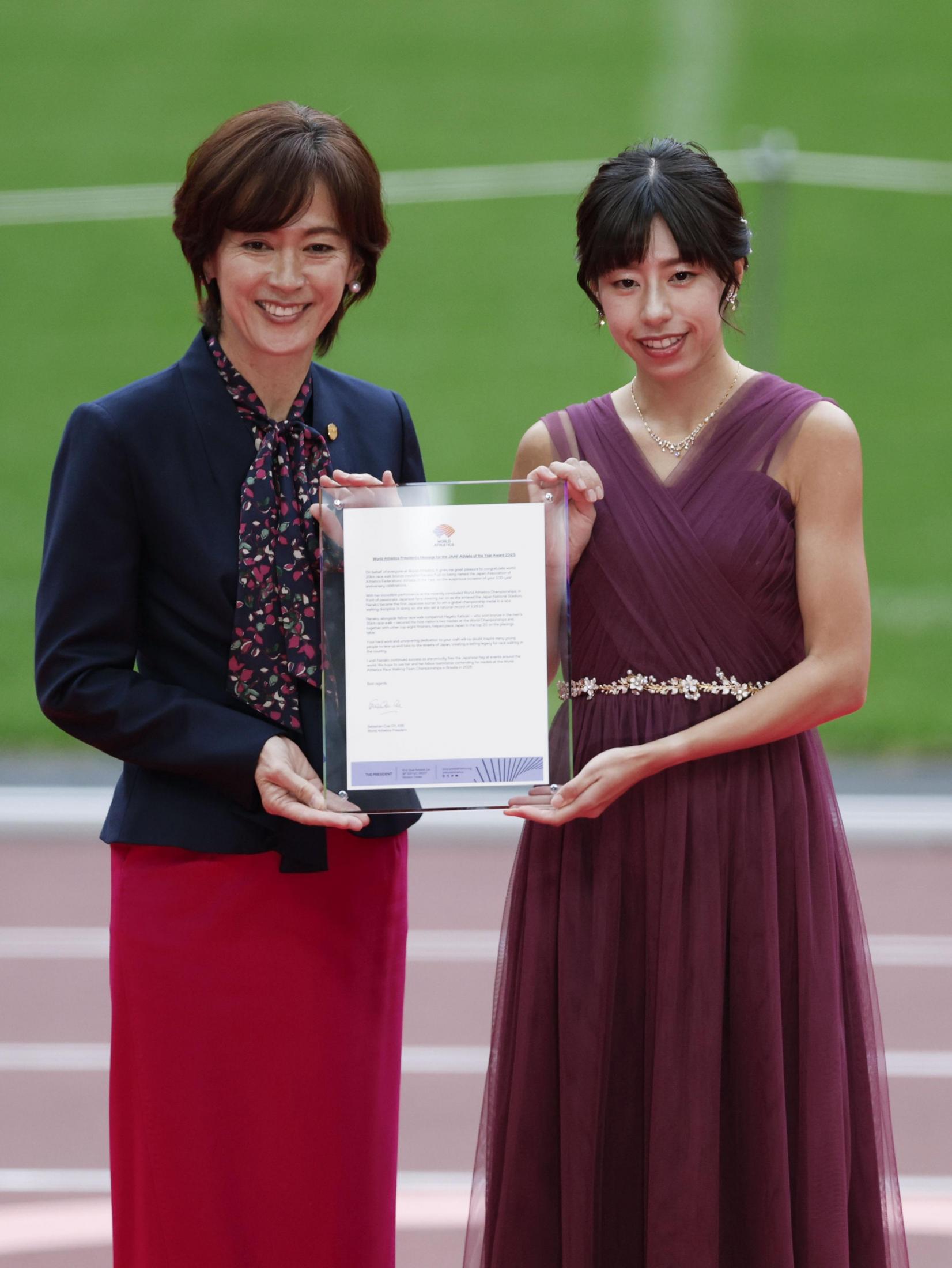 日本陸連の年間表彰式「アスレティックス・アワード」が29日、東京・国立競技場で行われ、世界選手権東京大会女子20キロ競歩3位の藤井菜々子が年間最優秀選手に選出された。日本競歩女子で初めて世界選手権の表彰台に立った藤井は「歴史の中で新しい一歩を刻むことができた。とてもうれしい」と喜びを口にした。