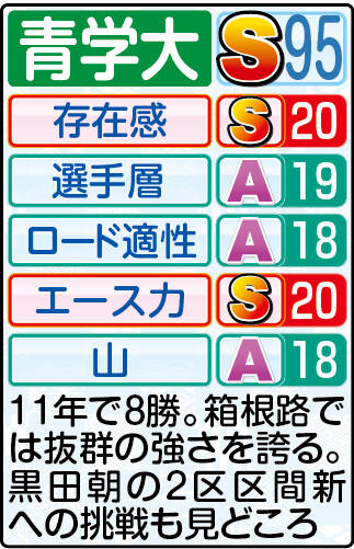 ◆戦力分析 前回、青学大は10時間41分19秒の大会新記録で圧勝した。原監督は「102回大会は春頃まで苦戦を覚悟していましたが、今では前回並みのタイムを出せる手応えがあります」と自信を見せる。その根拠についても「5、6区は前回より1分くらいタイムが落ちるかもしれませんが、7~10番手の力は前回より明らかに上です」と説明した。