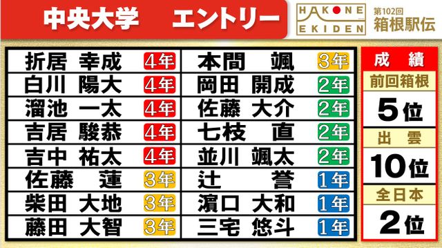 前回総合5位の中央大学は、1万メートル平均タイムは27分55秒98と出場チームトップ。岡田開成選手(2年)は先月、27分37秒06をマークしました。前回1区区間賞の主将・吉居駿恭選手(4年)や溜池一太選手(4年)、藤田大智選手(3年)、本間颯選手(3年)、濵口大和選手(1年)ら6人の27分台ランナーがそろいます。