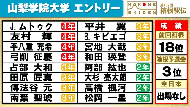 山梨学院大学は箱根駅伝予選会を全体トップで通過したキビエゴ選手(3年)や、前回大会8区で1年生ながら区間3位で予選会でも個人10位の力走をみせた阿部紘也選手(2年)などがメンバー入りしています。