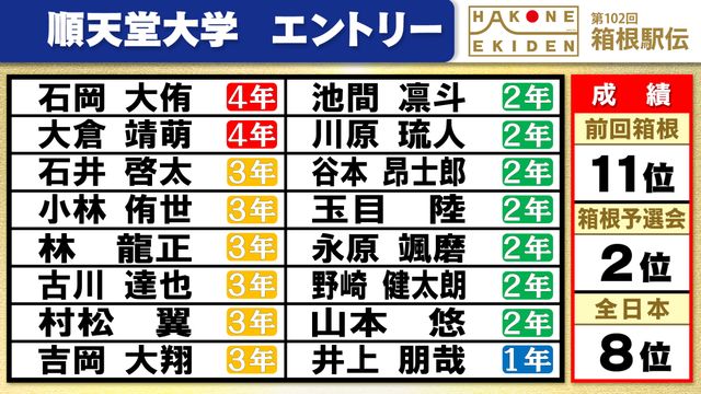 前回11位の順天堂大学。10月の予選会は2位で突破し、11月の全日本大学駅伝は8位に入りました。