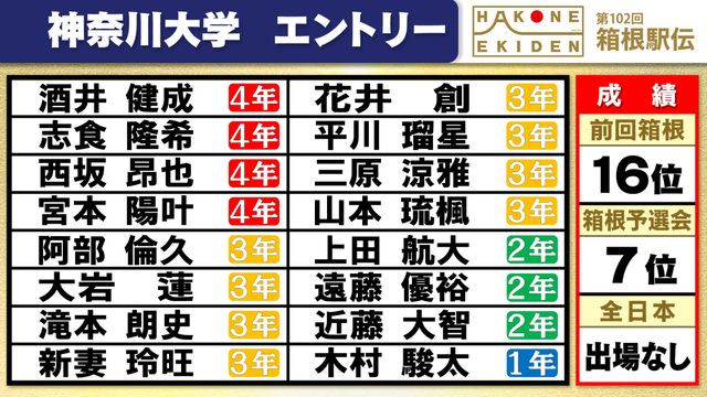前回総合16位の神奈川大学は、予選会7位で通過。ハーフマラソンで1時間01分09秒の記録を持つ宮本陽叶選手(4年)がチームトップで引っ張り、3年連続56回目の切符をつかみました。