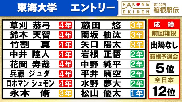 東海大学は、予選会を5位で通過。前回は予選会で敗れており、2年ぶりの箱根路となります。11月の全日本大学駅伝は12位でした。