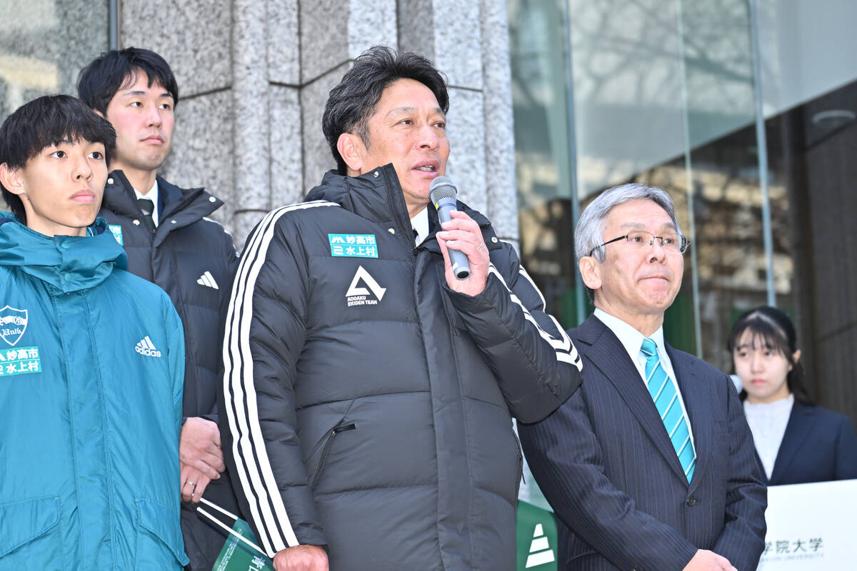 第102回箱根駅伝(来年1月2、3日)で3年連続9度目の優勝を狙う青学大は11日、東京・渋谷区の青山キャンパスで壮行会を行い、原晋監督(58)、主将でエースの黒田朝日(4年)らが昼休みに集まった学生、付属の高校生、卒業生、教職員らに大一番に向けた決意を語った。