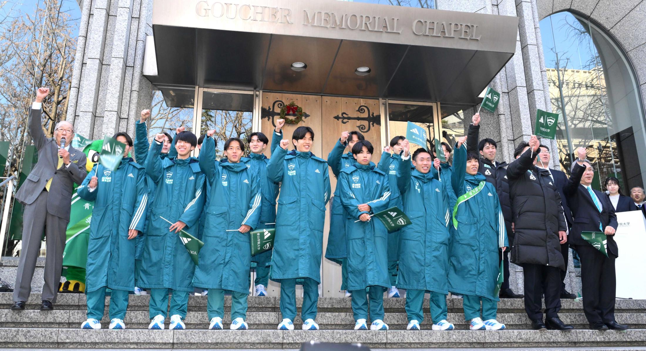来年1月2、3日に行われる第102回東京箱根間往復大学駅伝で3年連続9度目の総合優勝を目指す青学大が11日、東京・青山キャンパスで壮行会を行った。原晋監督(58)と、登録メンバー16人のうち授業出席者を除く13人が出席。難関とされる坂道区間を走る“山の神”候補に多くの選手が名乗りを上げた。往路で上り坂を走る5区には塩出翔太(4年)、鳥井健太(3年)、小河原陽琉(2年)、上野山拳士朗(1年)、下り坂になる復路の6区には、佐藤有一(4年)、遠藤大成(2年)が立候補した。