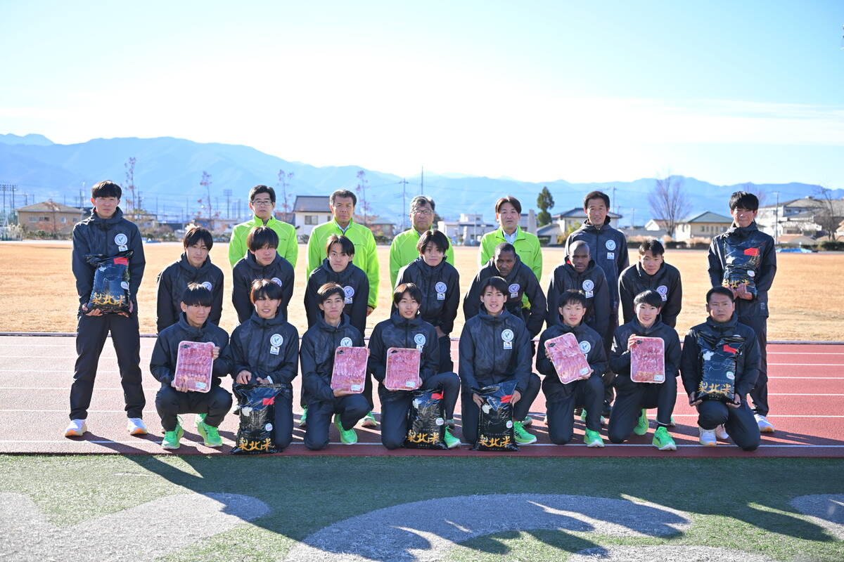 第102回箱根駅伝(来年1月2、3日)で、6年連続39回目の出場となる山梨学院大は12日、甲府市のグラウンドで、応援するJAバンク山梨から甲州牛10キロと地元ブランド米の梨北米60キロの差し入れを贈呈された。