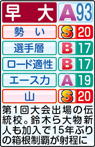 15年ぶりの箱根制覇のチャンスはある。早大は出雲2位、全日本5位。出雲2区9人抜き区間賞の主将・山口智、全日本8区日本人最高記録の工藤、スーパールーキー鈴木が“3本柱”。花田監督は「優勝するためには往路で勝たなければならない」とレースプランを明かす。