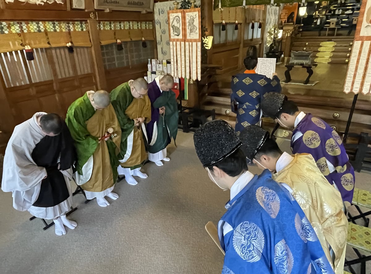 今月10日、開山700年を祝う行事が江島神社(同市)で開かれ、同神社の神職と遊行寺の僧侶が、社殿内で神事と仏事を交代に執り行い、江島弁財天への感謝をささげた。なぜ遊行寺の節目を江島神社で祝うのか-。それには、互いに深いつながりがあるからだ。