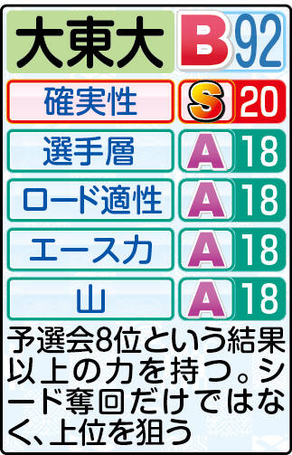 5000メートルとハーフマラソンで大東大記録を持つ大浜、5区経験者の中沢、3年連続3区出走中の入浜、全日本で1区を担った菅崎が往路候補だ。前回7区の宮倉、同10区の庄司ら復路経験者に加え、監督が大東大で初めて4年間指導した赤星主将ら最上級生の走りも、目標達成の鍵となる。