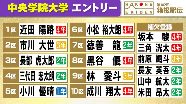 また前回大会で3区を走った市川大世選手(3年)は各チームのエースが集う2区へ。予選会では近田選手に次ぐチーム2番手でした。5区山上りには小川優晴選手(1年)が登録されました。