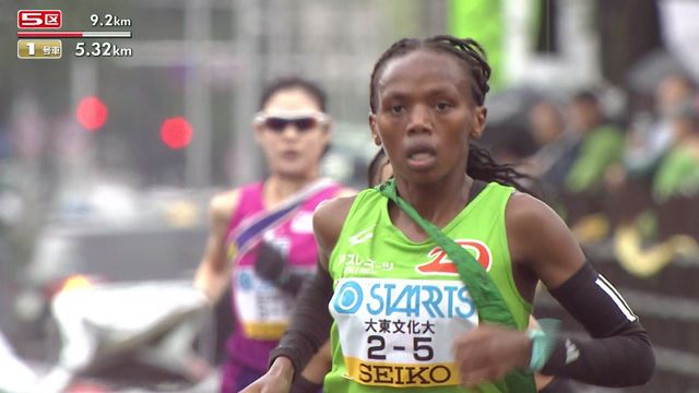 先頭の城西大学と47秒差の3位で迎えた最長10.5キロの5区では、タスキを受けたサラ ワンジル選手(3年)が激走。前を行く東北福祉大学をとらえると、5キロ付近でトップの城西大学を抜き、首位交代。エースの力走で2位に47秒の差をつけます。