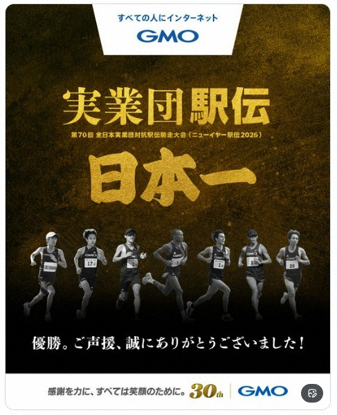 新進気鋭のチームが上州路を席巻し、次なる目標は連覇となる。歴史的なフィニッシュテープを切った鶴川は「先頭でアンカー走るのも駅伝人生で初めて。最高の景色だった」と喜びに浸り「GMOの2、3連覇とやっていけるように。これから黄金時代をつくっていこうと思います」と宣言した。