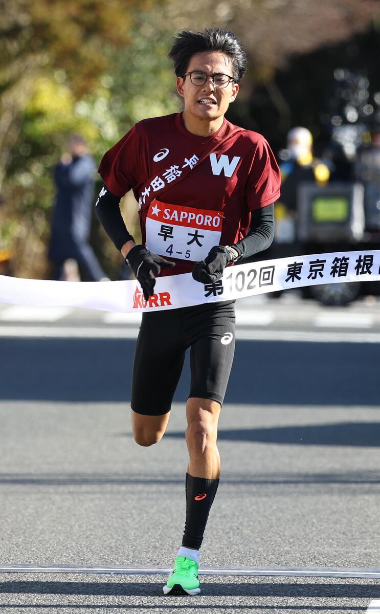 第102回東京箱根間往復大学駅伝競走(2日、5区間、往路107.5キロ)5区(20.8キロ)の〝山の神〟争いで敗れ、往路2位に終わった早大の工藤慎作(3年)はゴール後、仲間に抱きかかえられてベンチに腰掛けると号泣した。