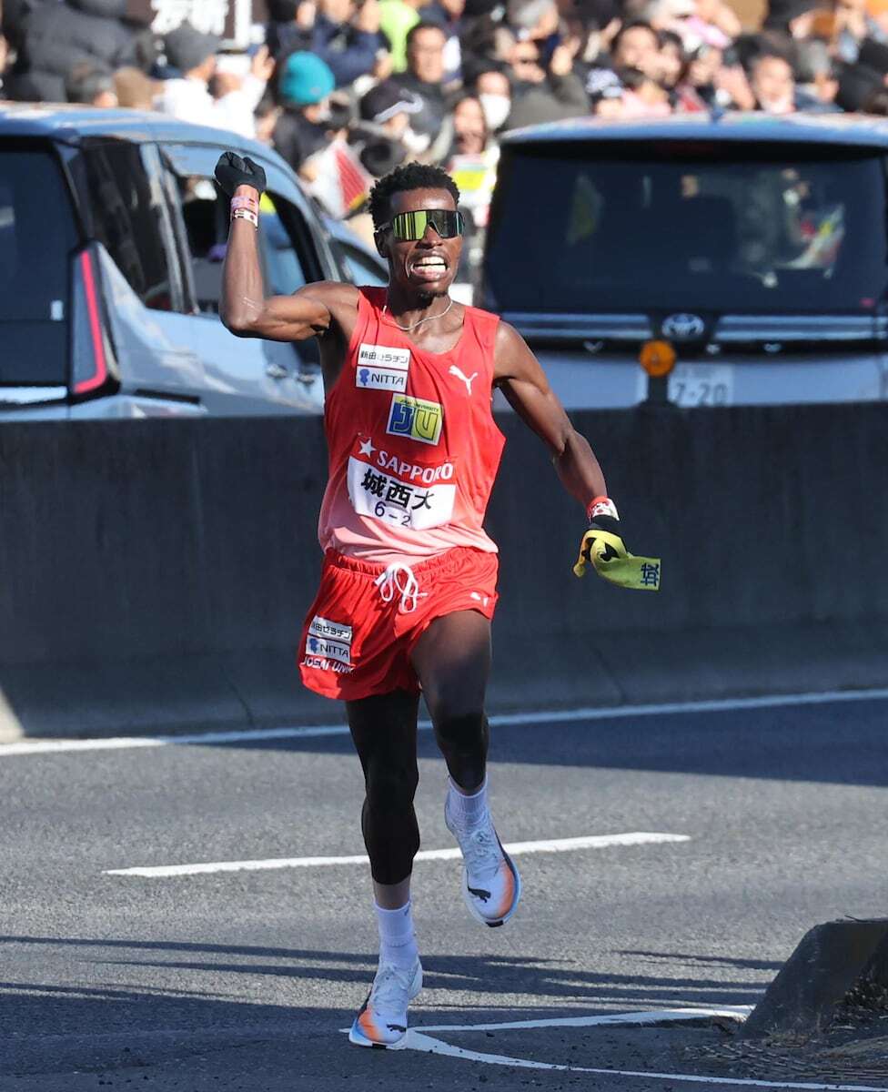 第102回東京箱根間往復大学駅伝競走(2日、5区間、往路107.5キロ)エース区間の2区(23・1キロ)では城西大のビクター・キムタイ(4年)が1時間5分9秒で区間新記録を樹立。前回大会で東京国際大のリチャード・エティーリ(現3年)がマークした1時間5分31秒を22秒上回った。6位でたすきを受け、城西大史上初の2区首位に押し上げた。