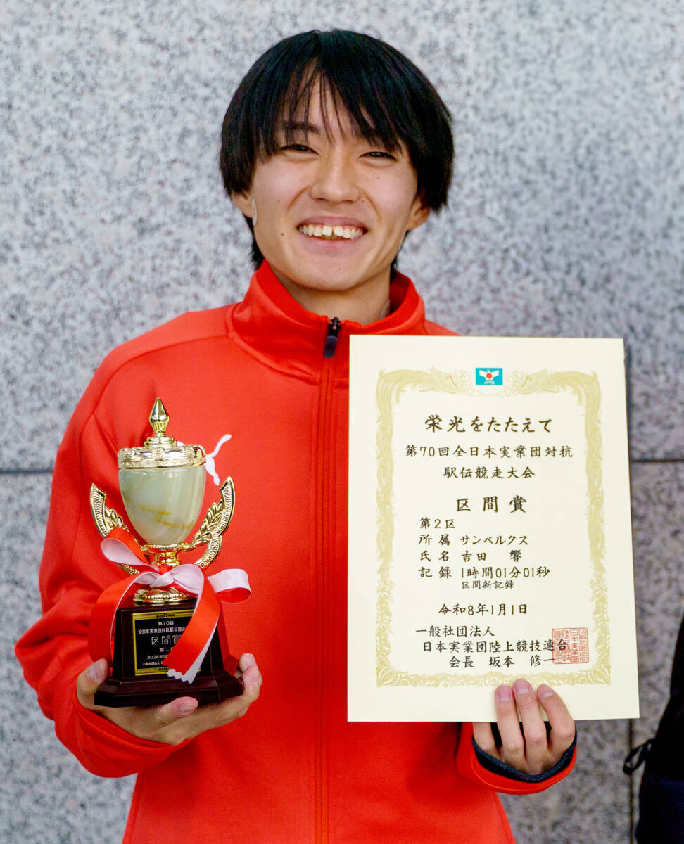 ◆吉田 響(よしだ・ひびき)2002年8月20日、静岡・御殿場市生まれ。23歳。原里中1年時に陸上を始め、東海大静岡翔洋から21年に東海大入学。1年時に箱根5区2位。3年時の23年4月に創価大に編入し、出雲5区区間賞相当、全日本5区区間新記録、箱根5区9位。4年時は出雲2区区間賞、全日本2区2位、箱根2区で日本人最高記録の1時間5分43秒で区間2位。25年に卒業後、サンベルクスとスポンサー契約を結び、プロ転向。自己ベストは5000メートルが13分39秒94、1万メートルが28分12秒01。161センチ、46キロ。