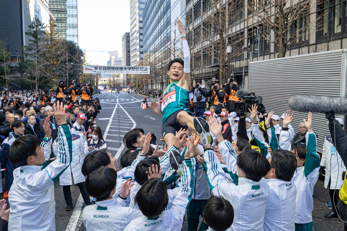 強すぎた。青学大アンカー折田壮太(2年)は、ライバル校と昨季の青学大チームを引き離して、優勝のゴールテープを切った。3分45秒、距離にして約1キロも大会記録を更新。折田が宙に舞った後、原監督は選手に「9回だぞ!」とリクエストして胴上げされた。「輝け大作戦は大成功です。300点です」。箱根駅伝の監督として最多の9勝目を飾った指揮官は満面の笑みで話した。