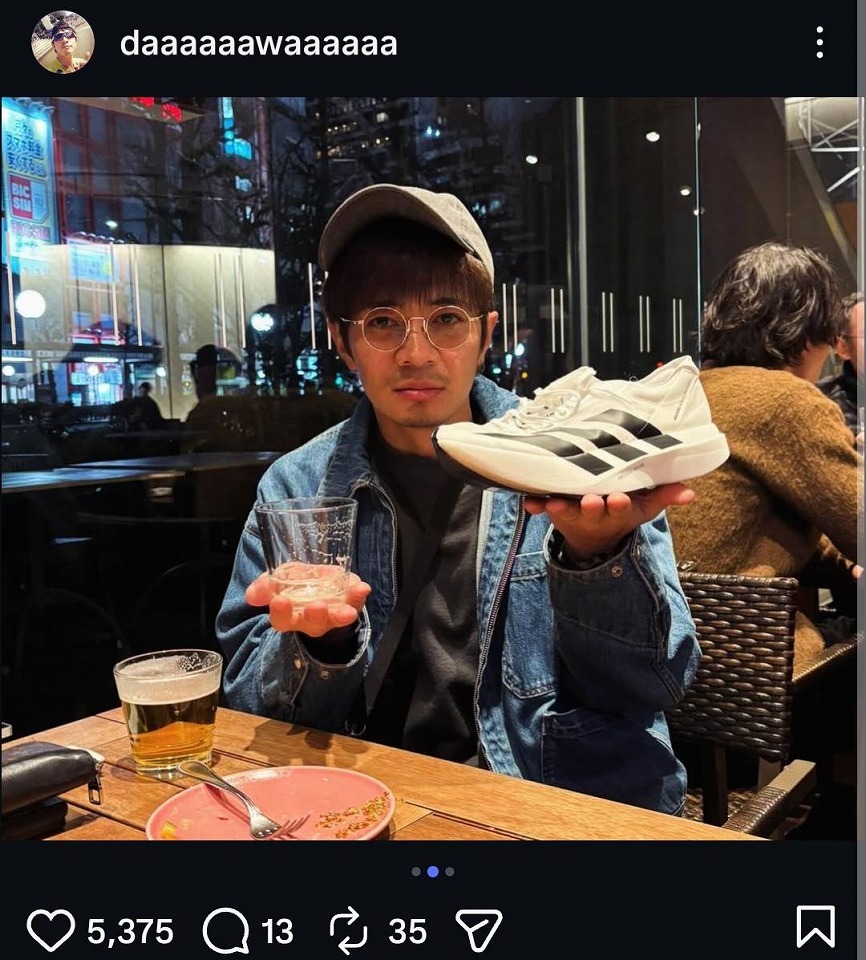 さらに「誰かが持ってきてた、東京国際大リチャード・エティーリが先日の箱根駅伝で実際に履いてたシューズ。グラスと重さ比べしたらこんな感じです。軽ッ!!笑」と続け、天秤のように両手にグラスとシューズを持ち、グラスを下に下げてシューズの軽さを強調した。
