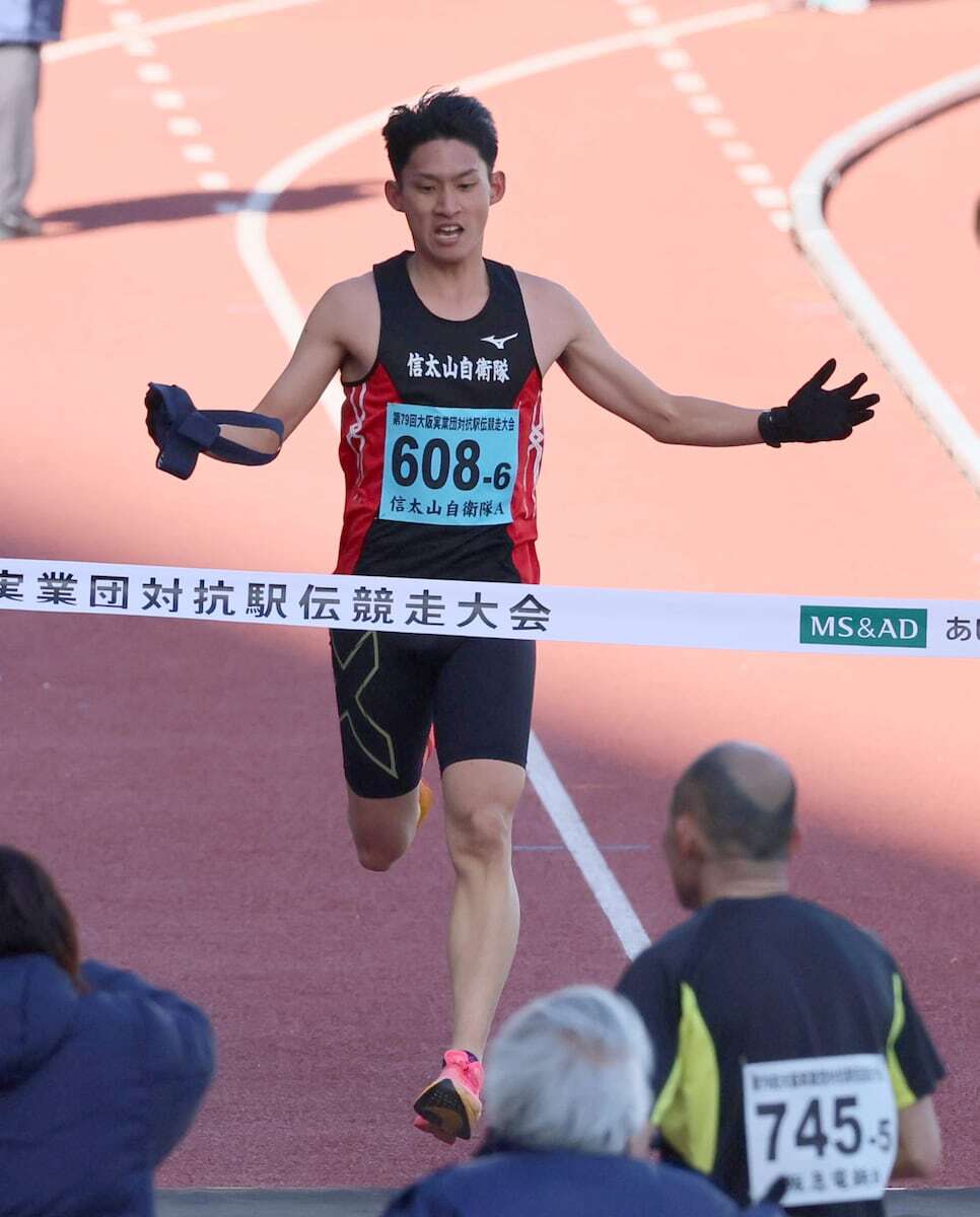 大阪実業団対抗駅伝競走大会(11日、ヤンマースタジアム長居発着~長居公園周回)6部は信太山自衛隊Aが制した。3区以降の4区間で続けて区間賞を取り、アンカーを務めた入隊3年目の中田龍之進は「風が強い中で各人が対応して優勝できてよかった」と喜んだ。午前8時15分の課業開始までが貴重なチーム練習の時間で、毎朝6時半ごろに集合して走っている。チームは一昨年まで1部にエントリーして上位争いをしていただけに「来年以降、また1部でしっかり頑張っていきたい」とさらに上を見据えた。