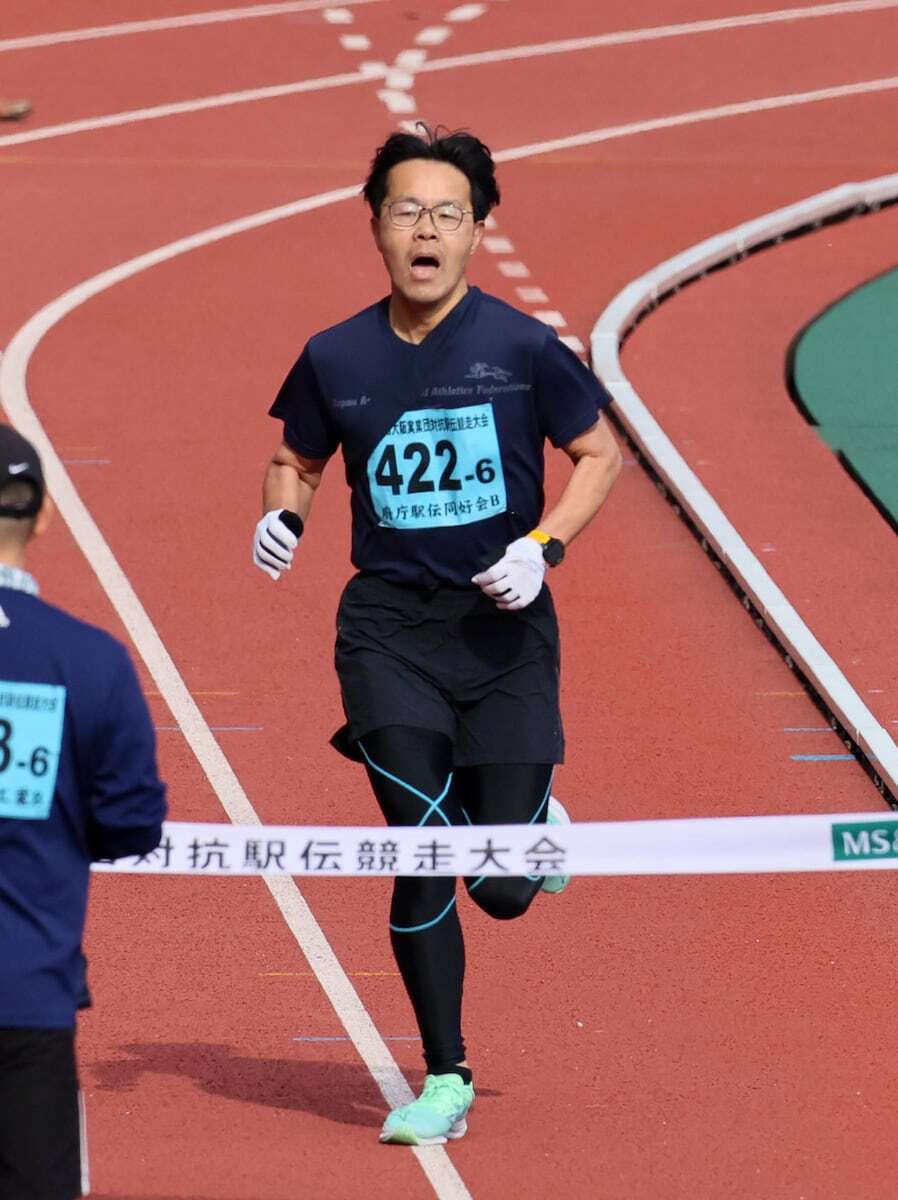 大阪実業団対抗駅伝競走大会(11日、ヤンマースタジアム長居発着~長居公園周回)4部優勝の大阪府庁駅伝同好会Bは1区で首位から3分25秒遅れの21位と大きく出遅れたが、徐々に順位を上げ、最後は2位でタスキを受けた6区のアンカー清田正彰が36秒差を逆転し、勝利をつかんだ。レース中は順位が分からず、ゴール直前に急に目の前にテープが張られたといい、「びっくりしましたが、うれしかった」と笑顔。55歳で人生初というゴールテープの感触の余韻に浸った。
