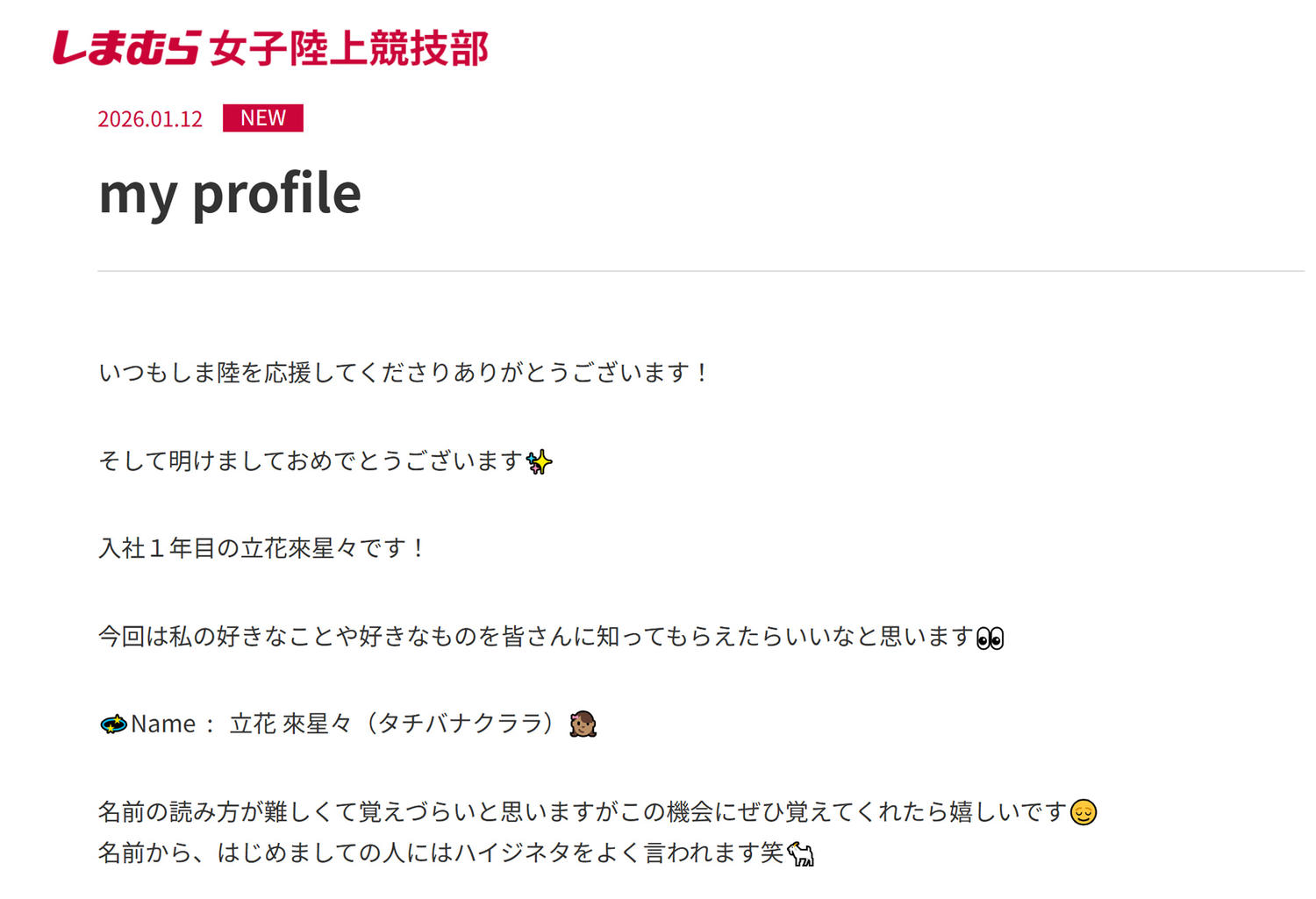 愛称「しま陸」こと、しまむら女子陸上部(埼玉・鴻巣市)の公式サイトは12日、同サイト内で昨年10月に開設したブログを更新。