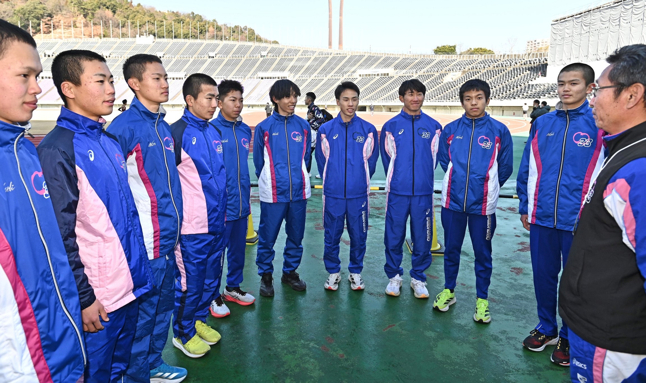 18日のひろしま男子駅伝に出場する岡山県チームは17日、広島市安佐南区のホットスタッフフィールド広島で最終調整に臨んだ。箱根駅伝で5区区間新をたたき出し、「シン・山の神」となった黒田朝日選手(21)=青学大、玉野光南高出=を中心に各区間で実力者がそろい、2年ぶりの入賞を目指す。