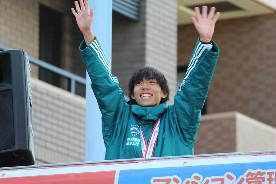 原晋監督のほか、主将・黒田朝日ら箱根路を駆け抜けた選手がオープンバスに乗車。約300メートルのパレードが実施された。応援団や吹奏楽隊による演出とともに、多くの祝福を受けた。