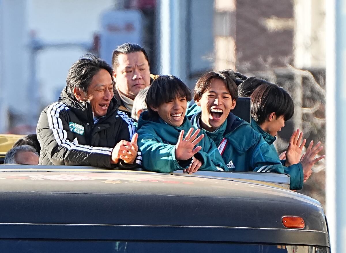 1月2、3日の第102回箱根駅伝で9度目の総合優勝を飾った青学大が25日、練習拠点とする相模原キャンパスの最寄り駅、JR淵野辺駅周辺で優勝パレードを実施した。箱根メンバーらは約300メートルの間オープンバスに乗り、約3万人のファンに笑顔を送った。パレードは大盛り上がりで、原監督も「私たちも輝きましたがファンの皆さんも輝いていますよ。輝け大作戦大成功!」とファンに感謝の気持ちを伝えた。
