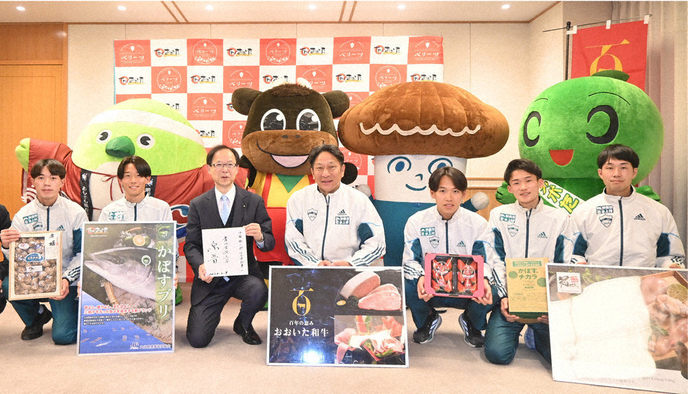 原監督や主将の中村海斗さん(3年)ら4選手が、9日に県庁を訪問。中村さんは「箱根駅伝4連覇を目指して、泥臭く粘り強く戦うチームの基盤をこの大分の地で作れることをうれしく思う」とあいさつ。佐藤知事は「ハードな練習だと思うが、温泉や大分の食材で疲れを癒やしてほしい」と激励し、かぼすブリなどの県産食材を差し入れた。
