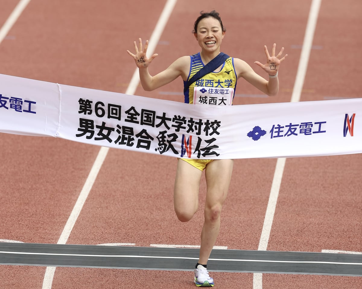 城西大は1区(3キロ)の大場崇義が残り400メートルで先頭集団から飛び出すと、2区(2キロ)の大西由菜が首位をキープ。3区(5キロ)以降も首位の座を譲らずに独走を続け、全区間区間賞の完全制覇だった。