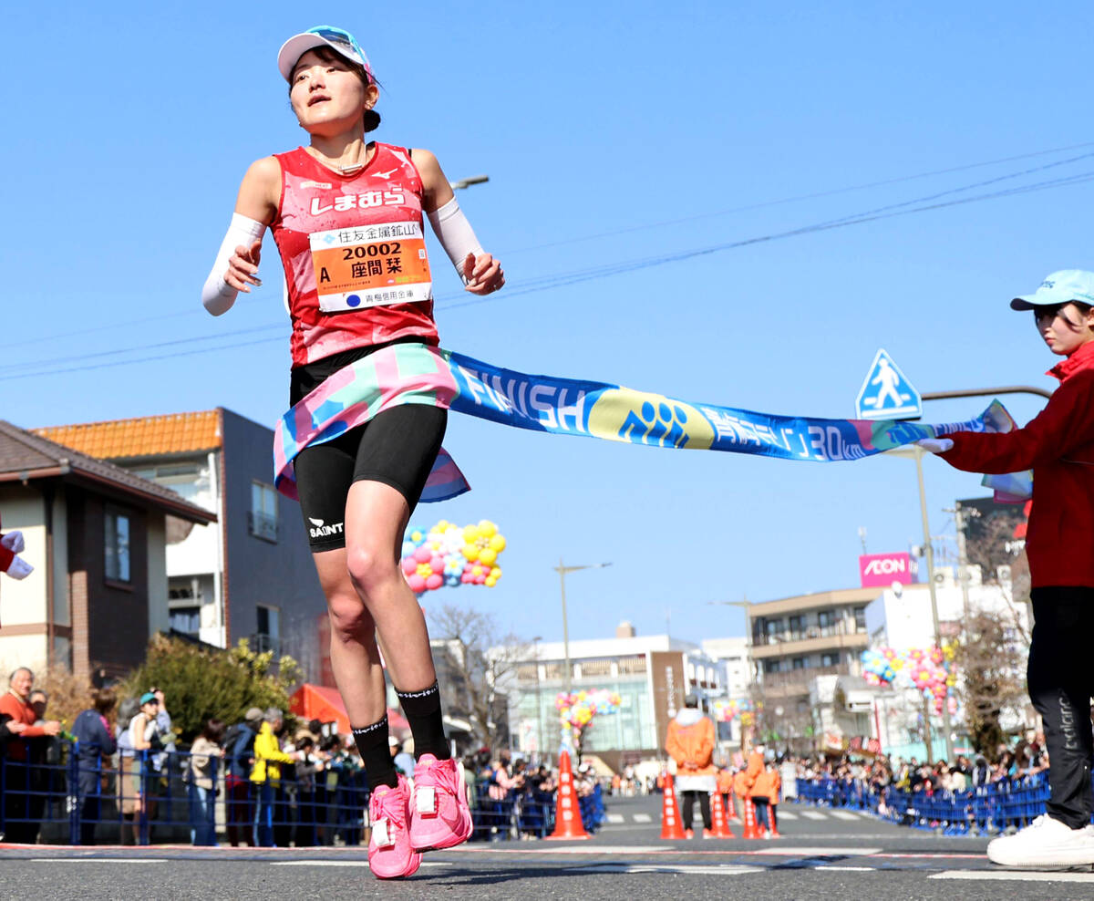 男女混合レースのメリットを生かして、序盤から「独走」した。「男子選手の集団の中で走りやすかったです。折り返してからは市民ランナーの皆さんが声をかけてもらって力になりました」と座間は圧勝のレースを充実の表情で振り返った。