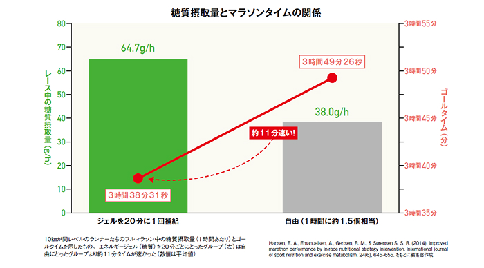 2~3月はフルマラソンが多数開催される時期。フルマラソンのレース中に多くの人が補給するエネルギージェルですが、本誌の取材ではほとんどの人が摂取量について「3個以内」と答えていました。ところが、この摂取量を増やすとフルマラソンのタイムが速くなることを示したデータがあるのです。